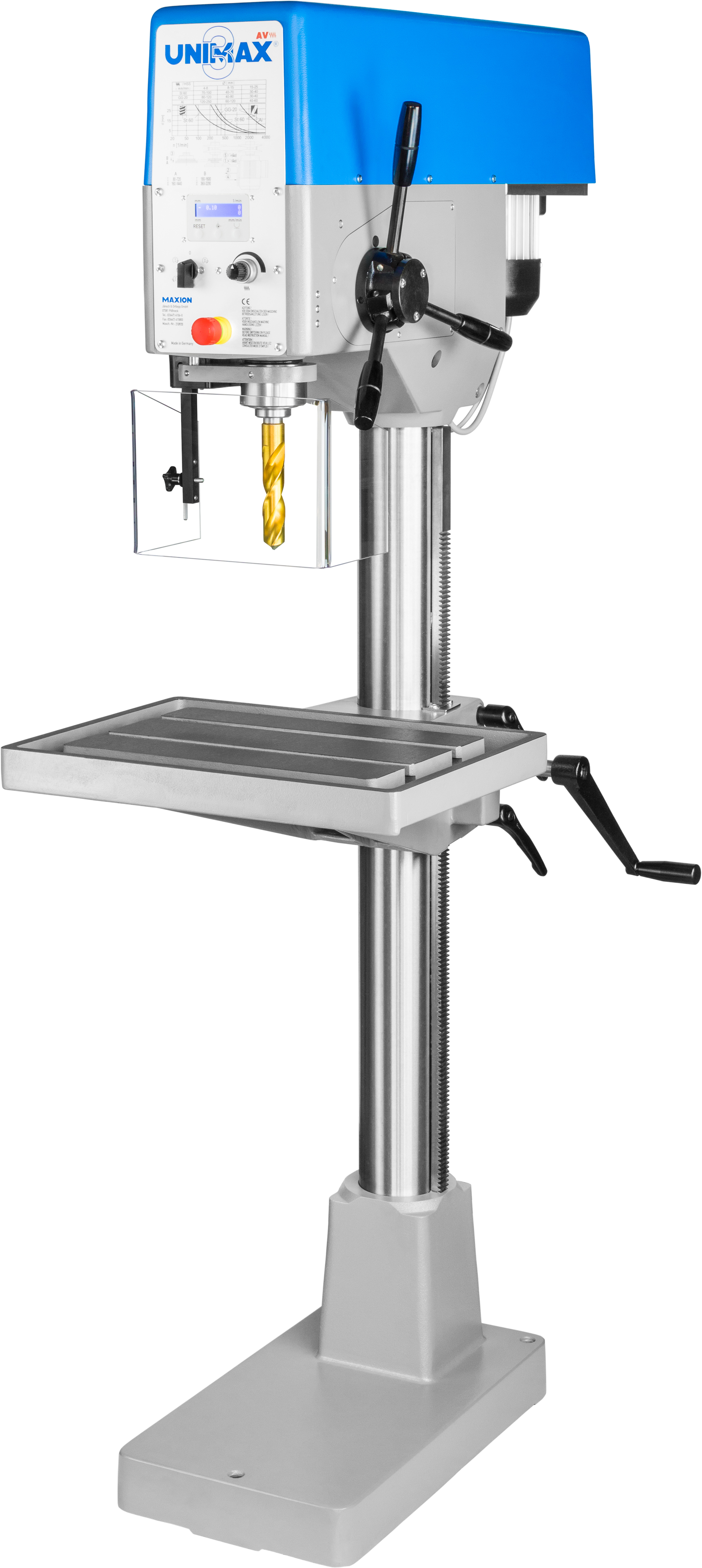 Modern, precise production drilling machine according to the successful concept of UNIMAX 3, with stepless variable feed drive, automatic tool ejector and chip breaking function as standard. Digital display indicates feed rate, spindle rpm and drilling depth; programmable drilling depth.